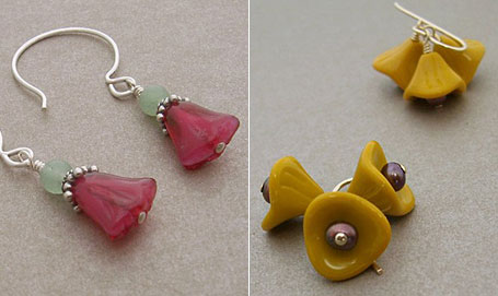 Pictured above left are the Dew on a Petal earrings (US $15.00), for which Renee has placed a serpentine dewdrop atop a fuchia Czech glass petal, accented with a silver lacey cap. Such pretty colours & such a peaceful concept! The Retro Blooms earrings (above right, US $17.00) are probably my favourites, with the clusters of mustard yellow Czech glass blooms and burgundy freshwater pearl stamens. (I must confess to being a bit of a nature nut myself.)